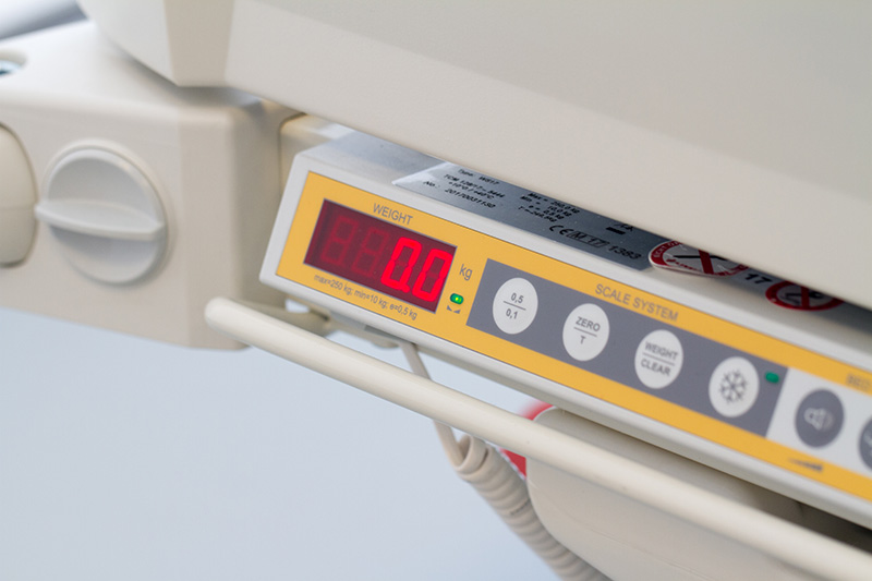Las básculas integradas indican de manera automática el peso actual del paciente, cambios en el tiempo e incluyen un sistema para el aumento o remoción de accesorios.