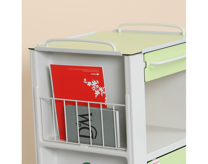 La mesa de paciente Eleganza Classic, con o sin atril abatible, puede ser colocada a la izquierda o a la derecha de la cama, manteniendo todas sus funciones.