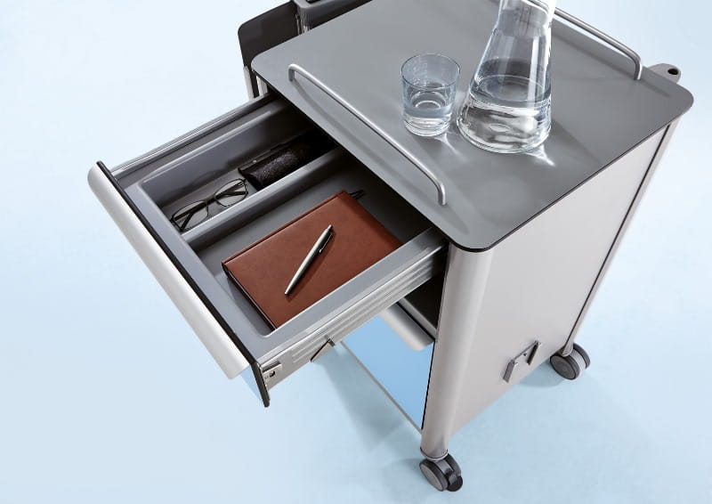 Higher product versions offer additional storage space. Robust drawers with integrated bottle holders help to keep things tidy.