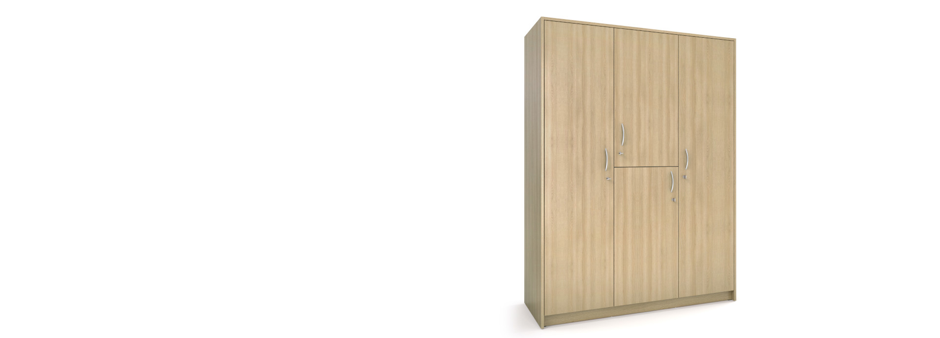 Armario para dos personas con 4 puertas, barra de confección y estantes. Gracias a las 4 puertas con tiradores ergonómicos en arco de 128 mm, el residente puede abrirlo y cerrarlo fácilmente. El sistema de cierre suave perforado e integrado reduce el ruido del cierre de las puertas. El armario se encuentra disponible con 1 o 2 compartimentos para objetos, los cuales pueden instalarse, por solicitud, a una altura adecuada para personas en silla de ruedas.