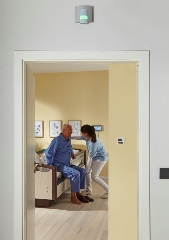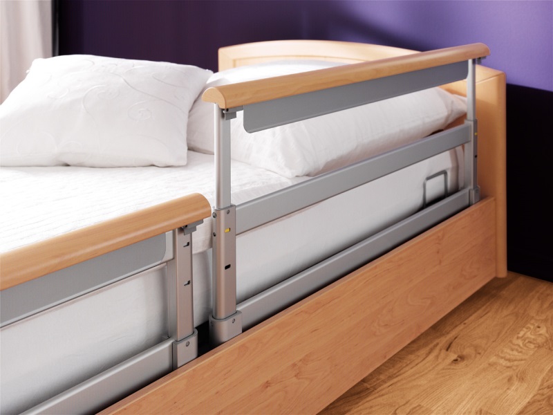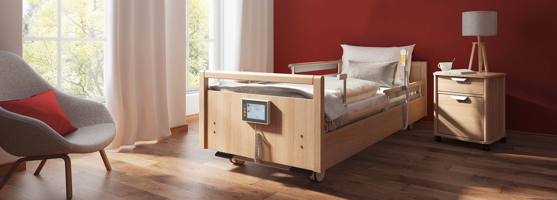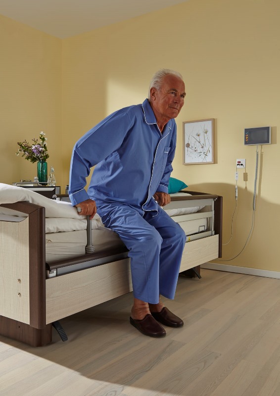 Una cama geriátrica, baja, universal, de alta tecnología, con especial atención a la prevención de caídas, la profilaxis de úlceras de decúbito y la movilización.