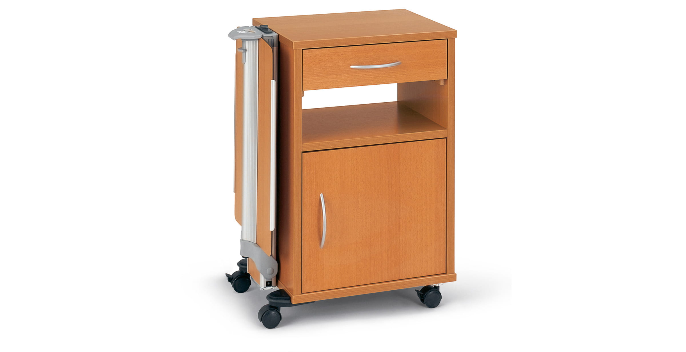 Una mesilla regulable en altura y mesilla deslizante que puede utilizarse en ambos lados. Práctica: dos raíles de soporte para libros.
