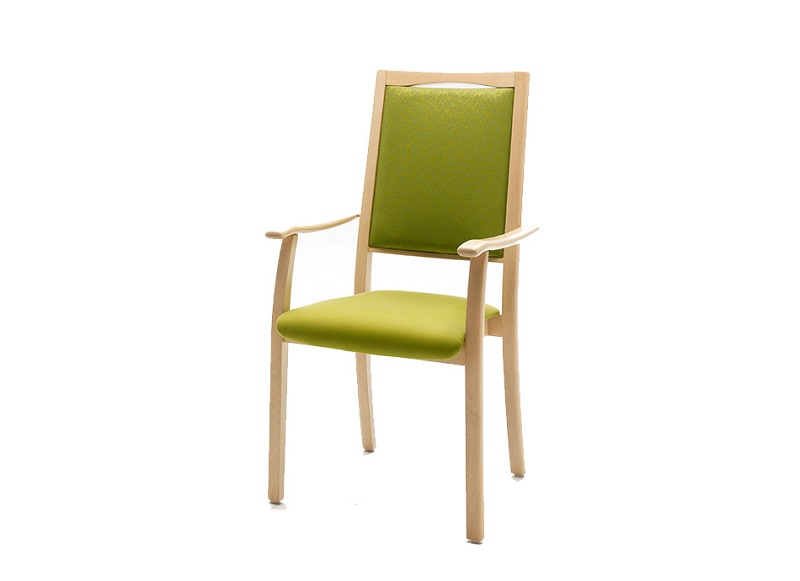 Una silla con respaldo alto, reposabrazos y perfiles romos. Alta comodidad gracias al asiento y respaldo tapizados. El respaldo alto ofrece un apoyo óptimo. Marco estable hecho de sólida madera lacada. Además, la silla es apilable. El hueco en la parte posterior puede emplearse a modo de asa.