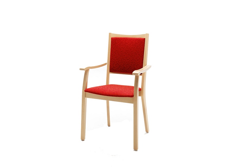 Una silla con un respaldo más largo, reposabrazos y perfiles rectos. Alta comodidad gracias al asiento y respaldo tapizados. Marco estable hecho de sólida madera lacada. Además, la silla es apilable.
