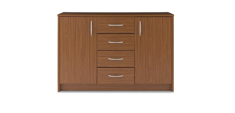 Cómoda con 4 cajones en el medio y dos puertas grandes en los lados izquierdo y derecho. La cómoda ofrece una gran cantidad de espacio de almacenamiento para objetos grandes y pequeños y puede abrirse fácilmente gracias a los tiradores de segmento curvo de 128 mm. Los cierres suaves perforados e integrados reducen el ruido del cierre de las puertas.