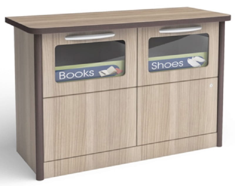 Una cómoda especialmente diseñada para pacientes que sufren demencia. Gracias al diseño bicolor, el residente puede distinguir mejor el contorno. Los cantos romos reducen el riesgo de lesión. A través de los cajones transparentes de la parte superior de la cómoda, el residente puede ver sus pertenencias a primera vista. Los cajones de la parte inferior pueden abrirse y cerrarse fácilmente con el sistema de cierre con empuje