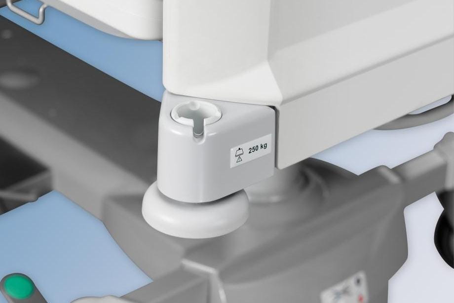 Los adaptadores para poste de elevación y barras de infusión están prácticamente localizados en las esquinas de la cama. Gracias a esto, son accesibles y no obstruyen en absoluto al paciente.