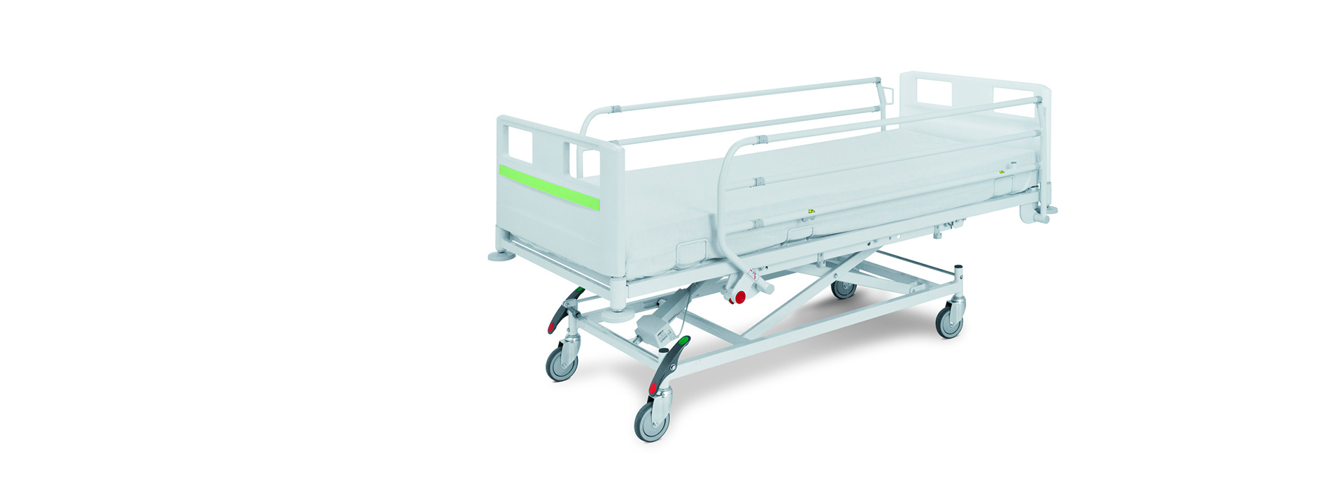 A hospital bed with height adjustment and mattress platform positioning by means of electric motors. The patient surface consists of 4 sections, and is made of welded meshing. The bed offers many degrees of vertical adjustment, and adjustment of patient surface area settings. A model with single collapsible side rails welded to the bed frame is also available.