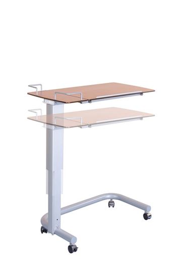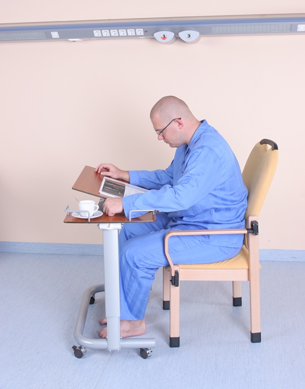 The Solido, patient overbed table has a lightweight design and features a height-adjustable and tilting dining board.