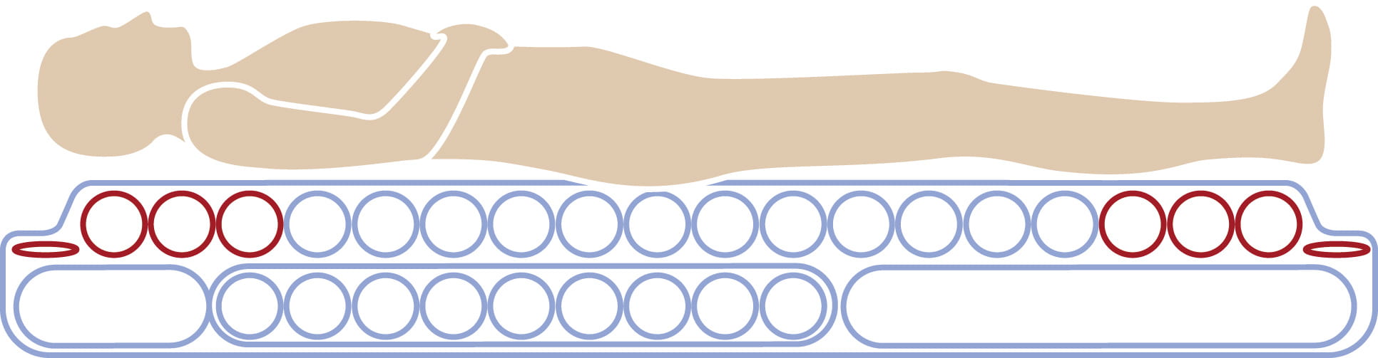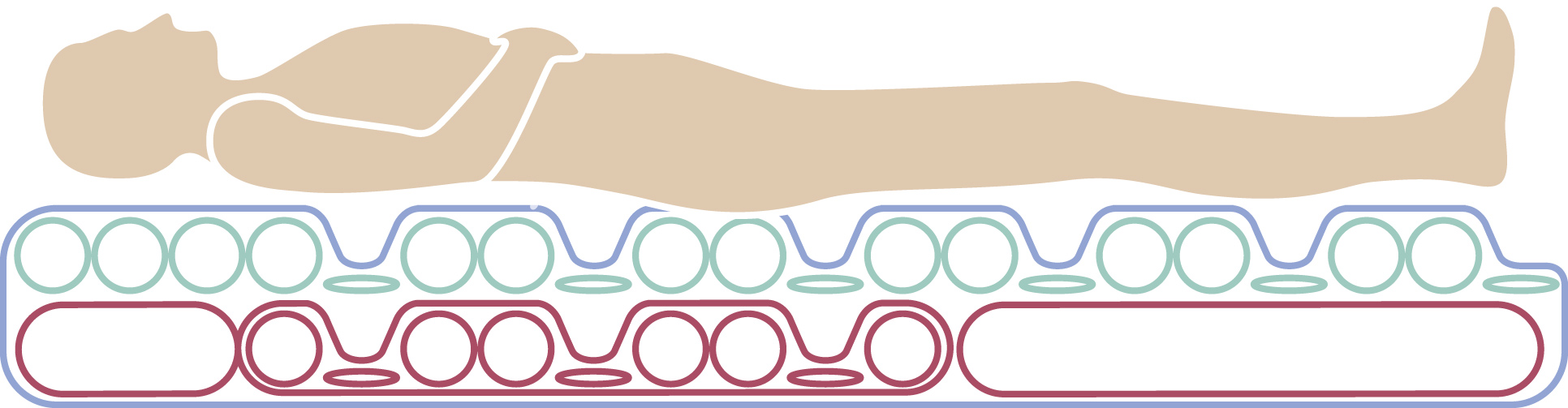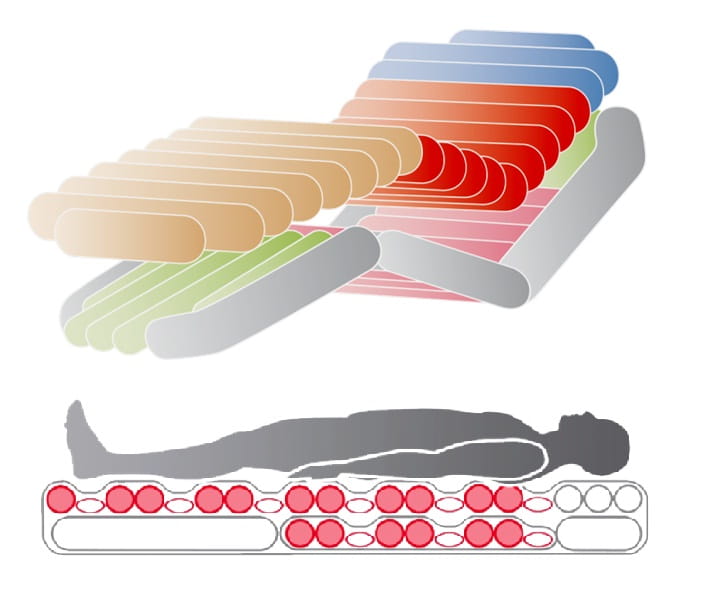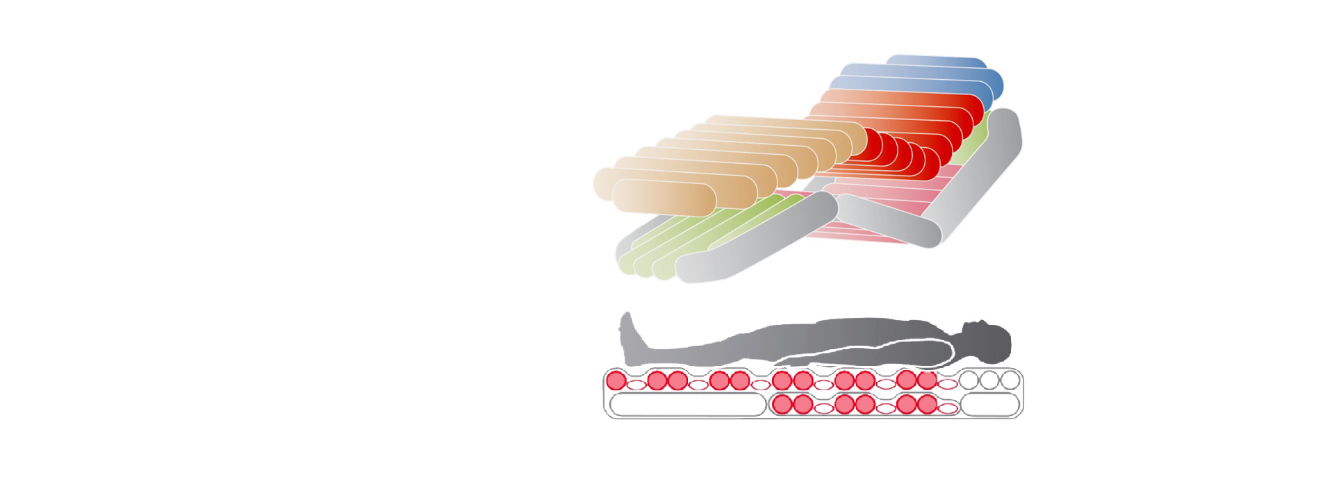 La terapia de presión alternante (tecnología de 3 celdas, presión cero, ciclo de 7,5 minutos) es el modo terapéutico fundamental, que reproduce el movimiento natural del cuerpo y así ayuda a prevenir y tratar úlceras de decúbito.